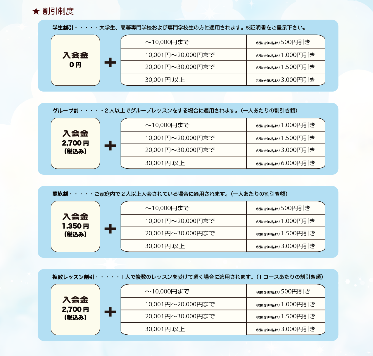 音楽教室ソラーレではマンツーマンレッスンでも低価格で、お気軽にレッスンを始められるよう心がけております。 さらに家族割引や複数コース割引など様々な割引料金やキャンペーンもございます。ぜひお気軽にご相談下さい。